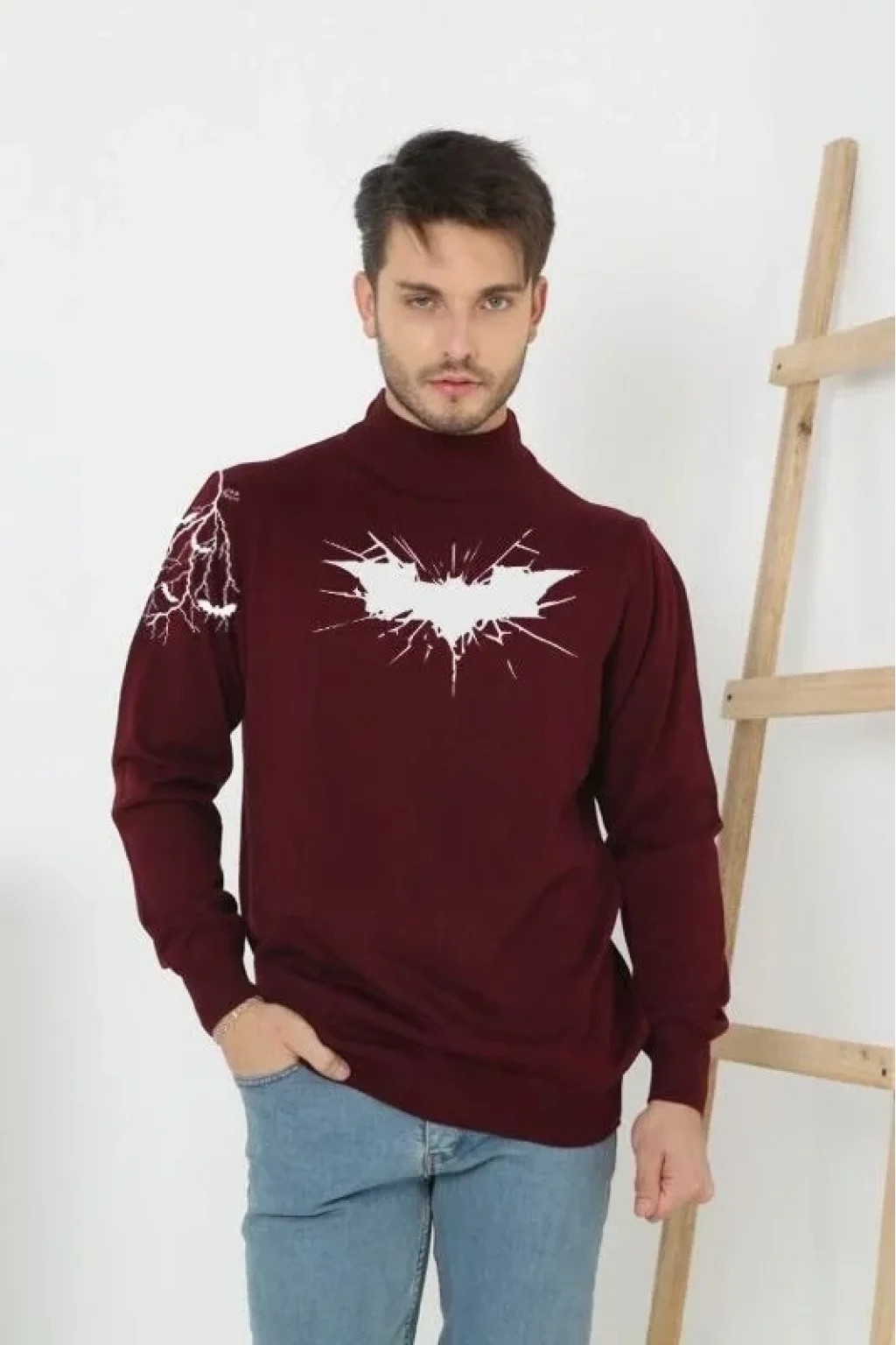 Unisex Yarım Boğazlı Baskılı Dokuma Triko - Bordo