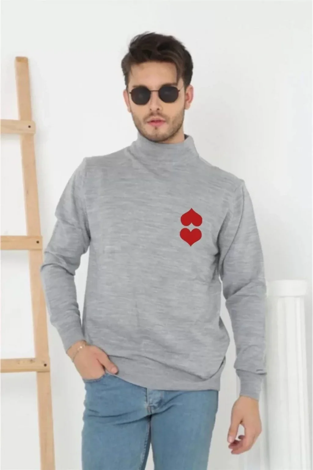 Unisex Yarım Boğazlı Baskılı Dokuma Triko - Gri