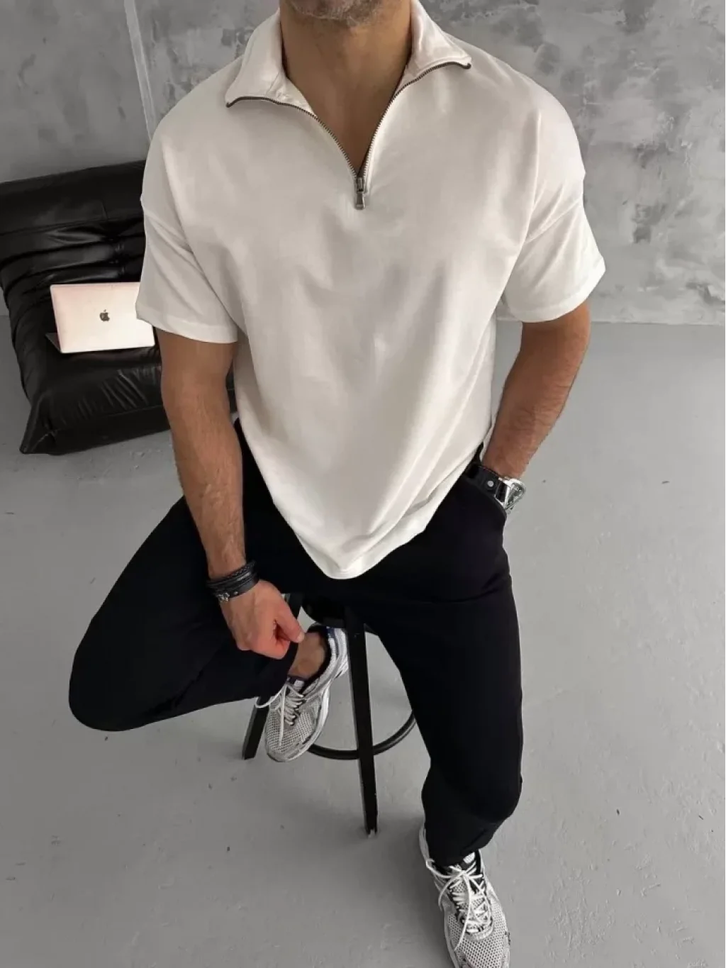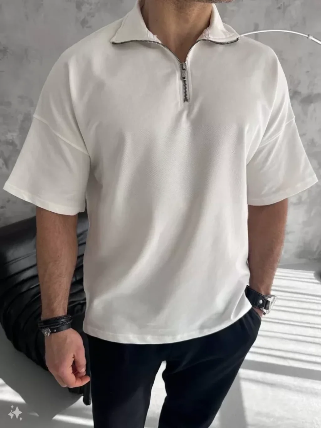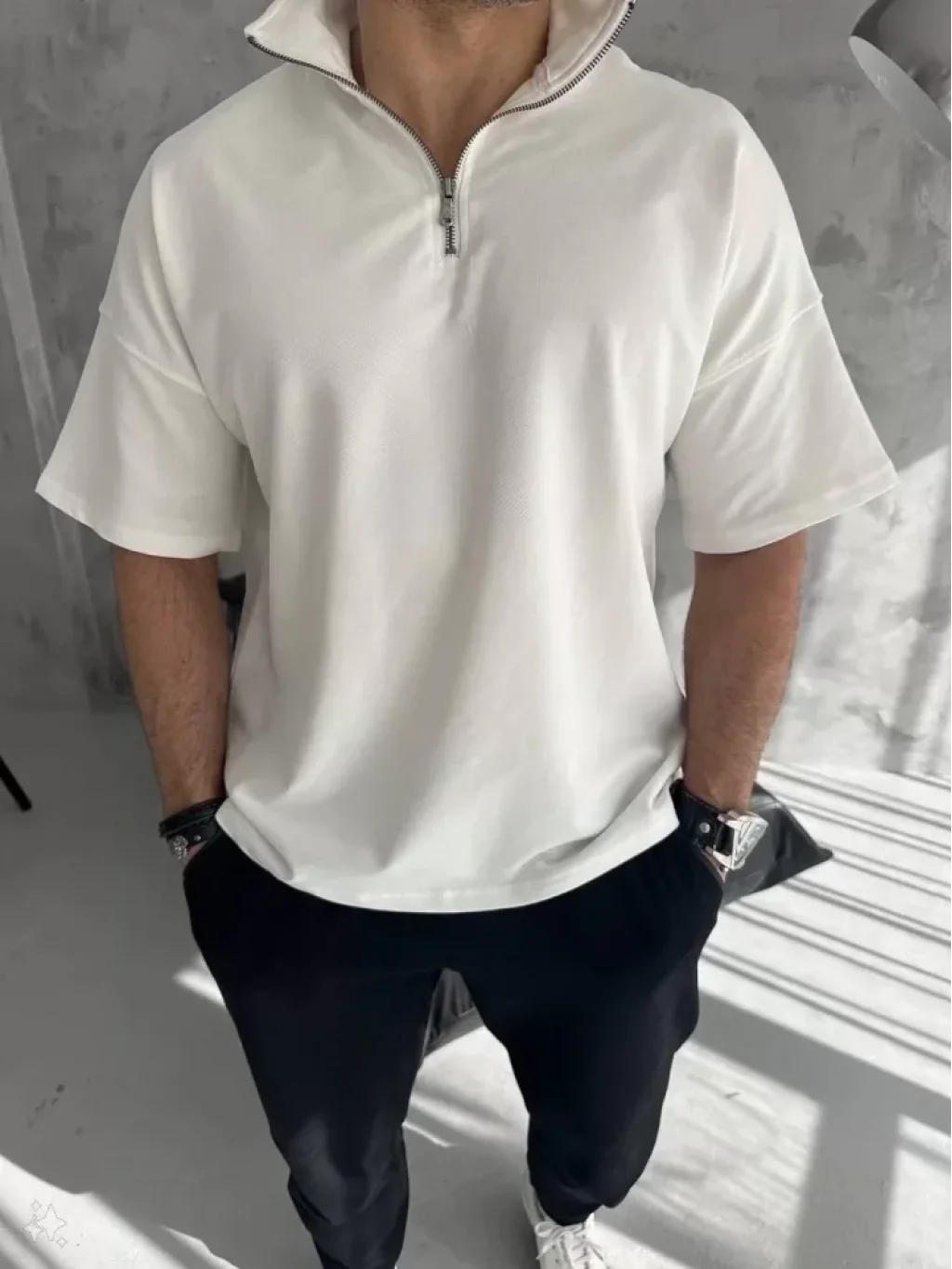 Unisex Yarım Fermuarlı Basic T-Shirt - Beyaz