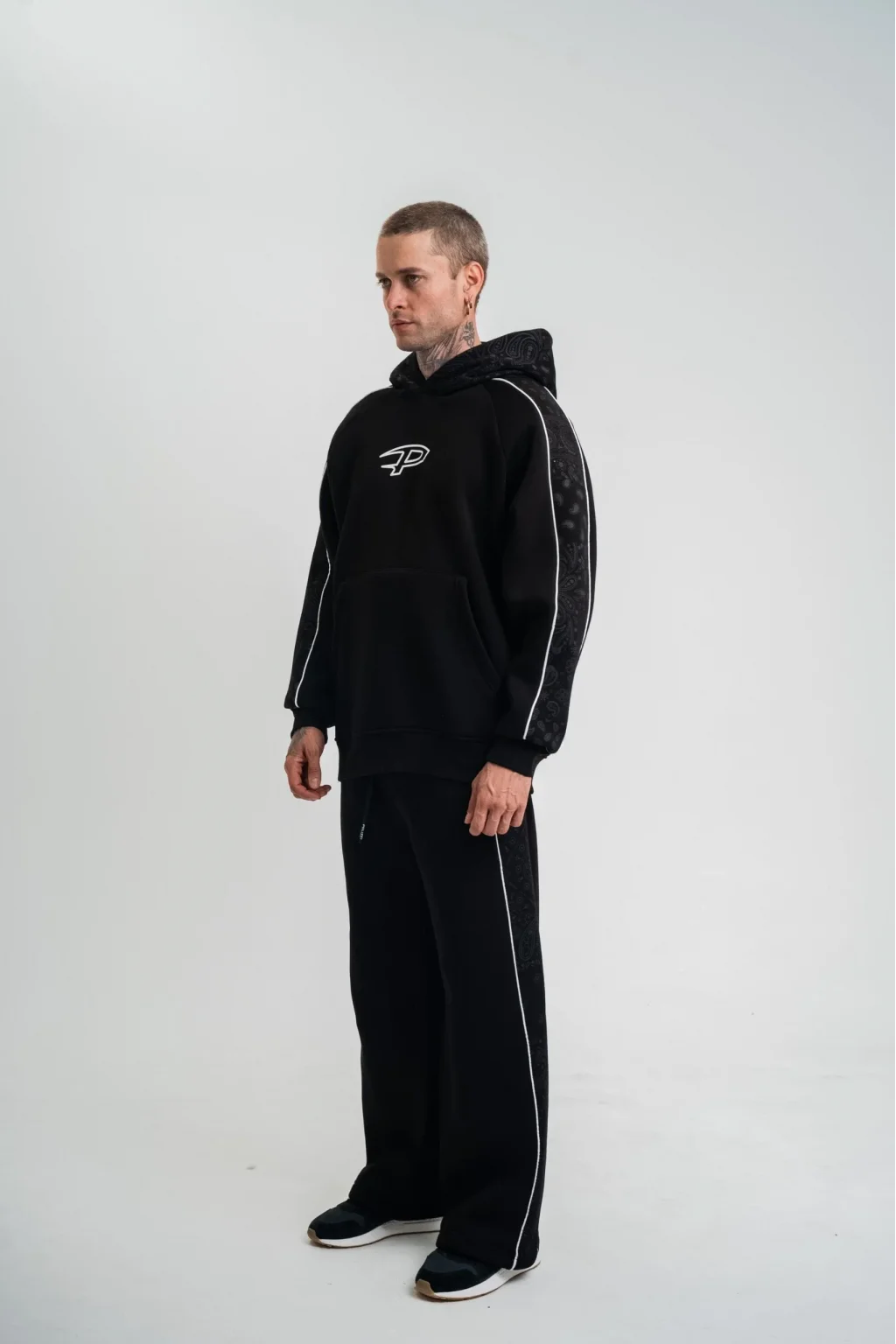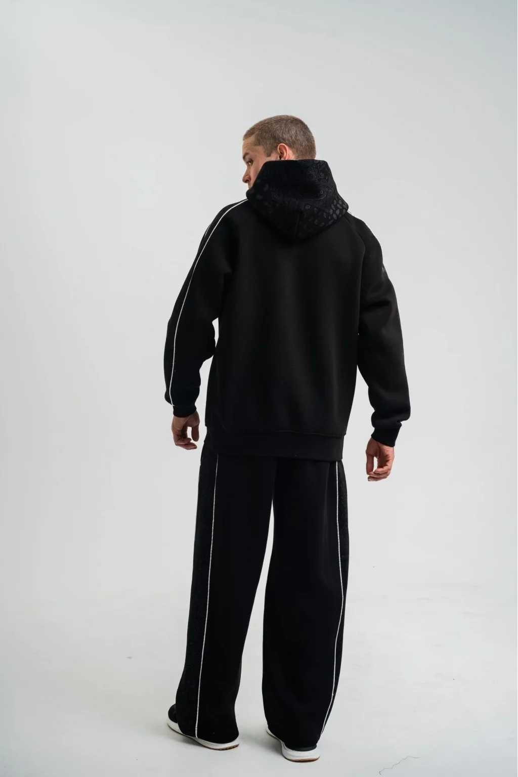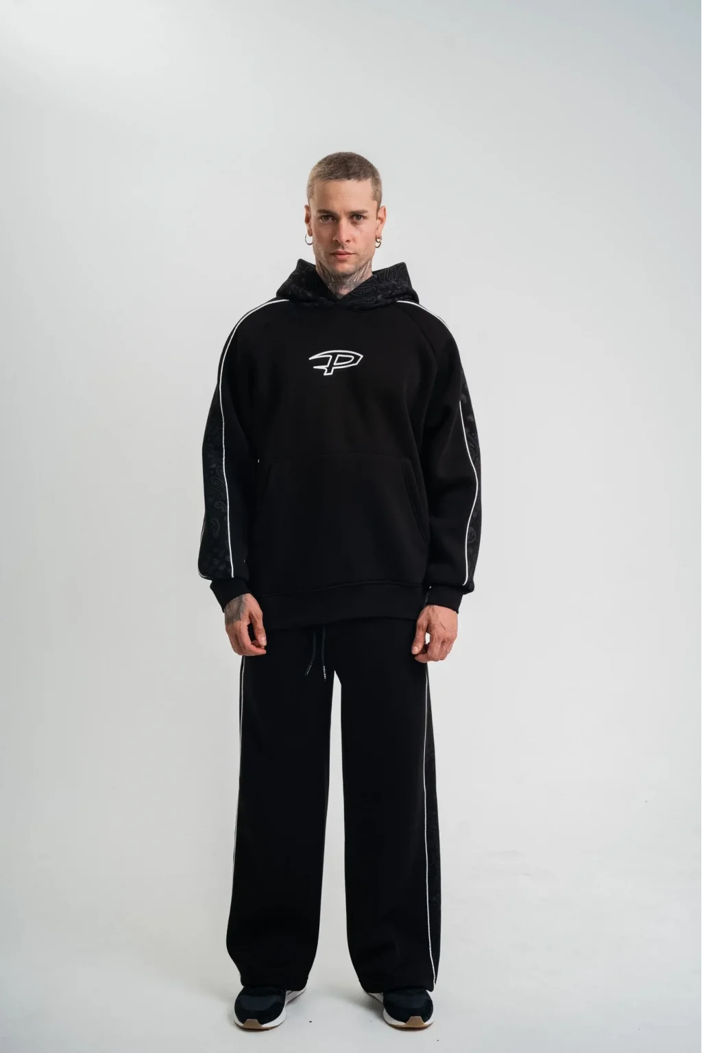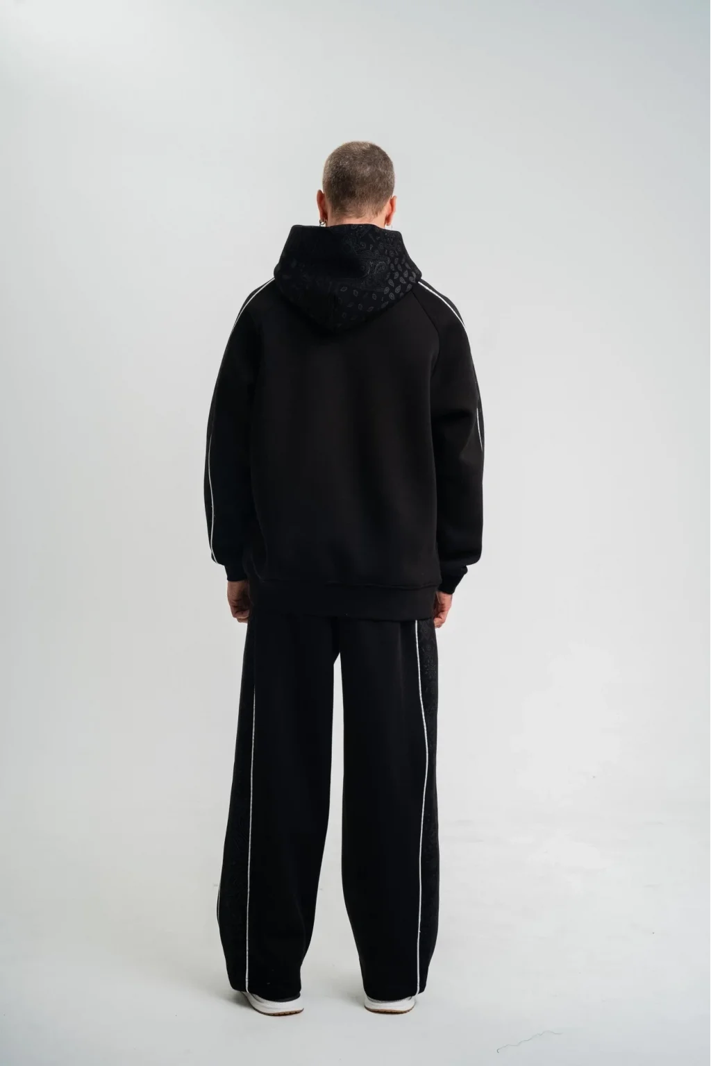 Uzun Kol Kapşonlu Ara Biyeli Baggy Eşofman Takım - Siyah