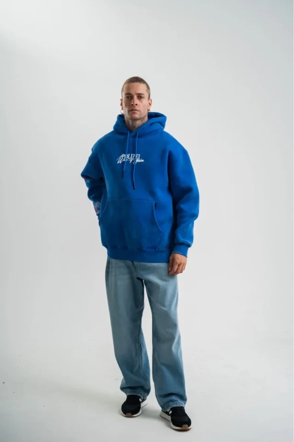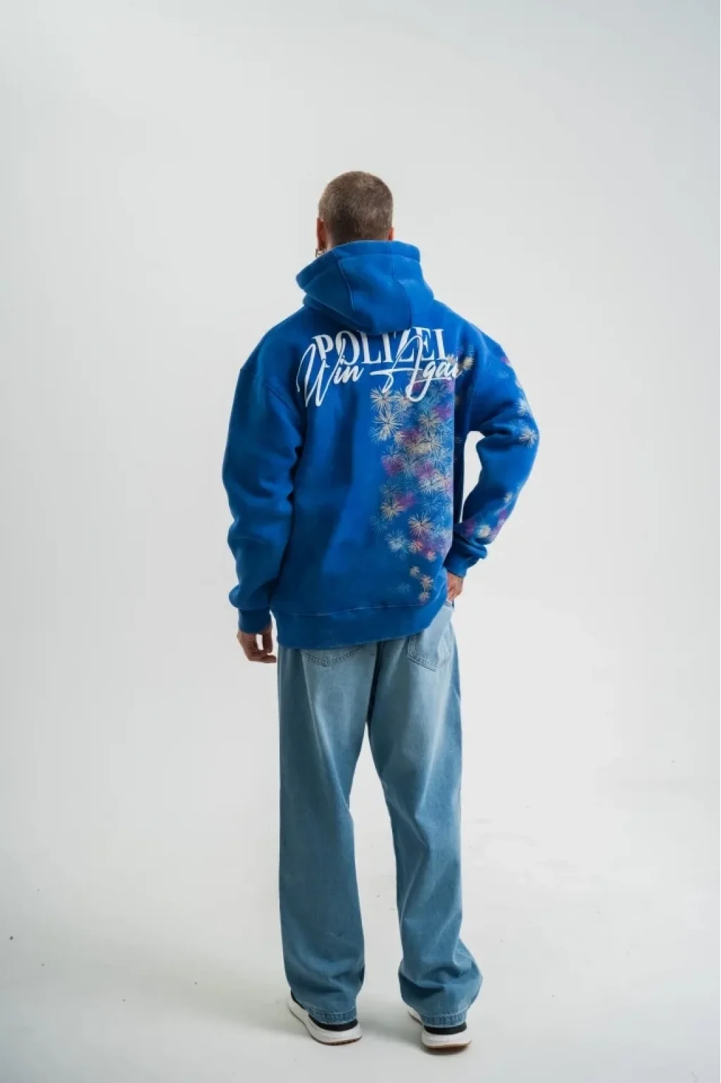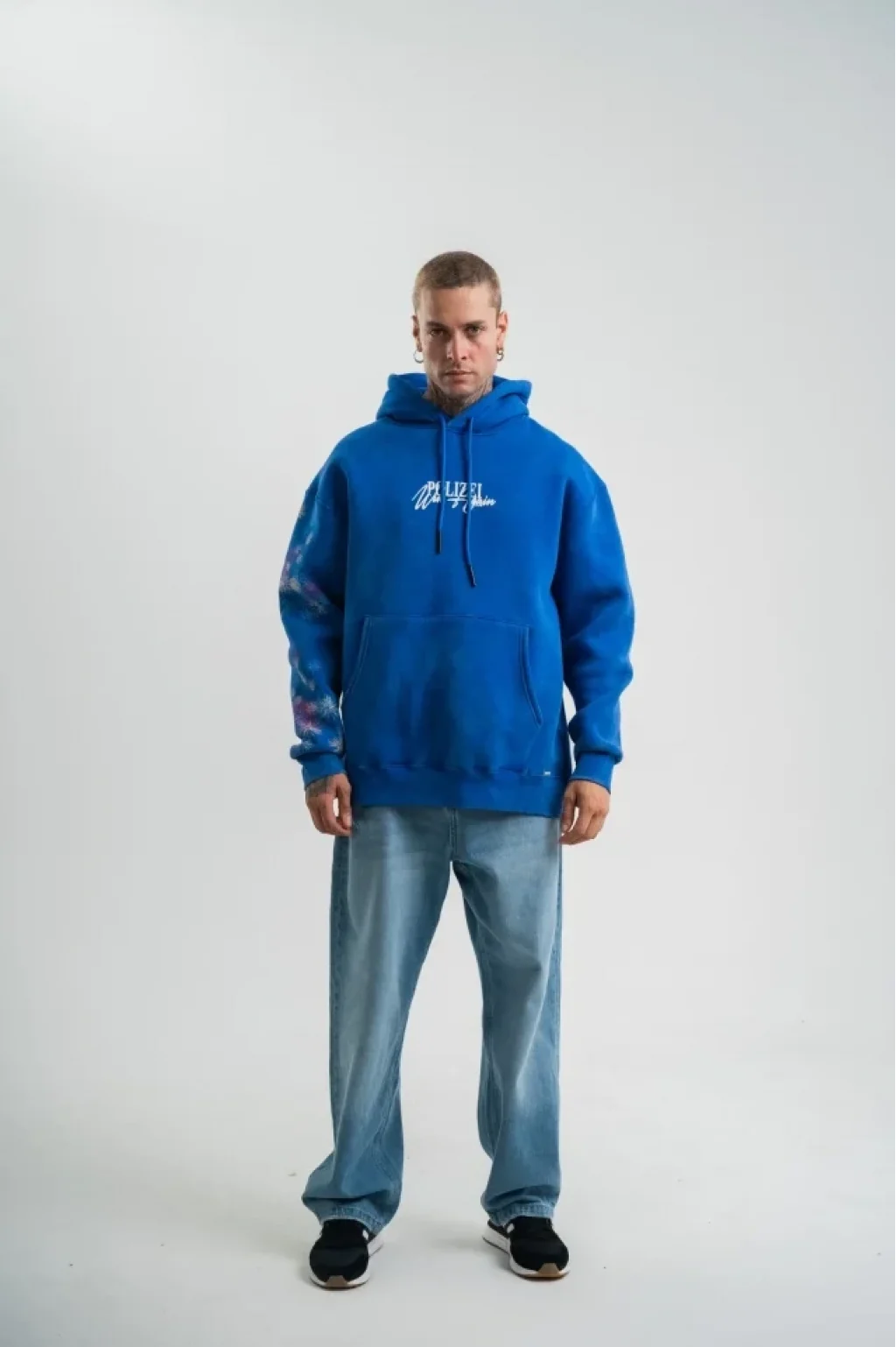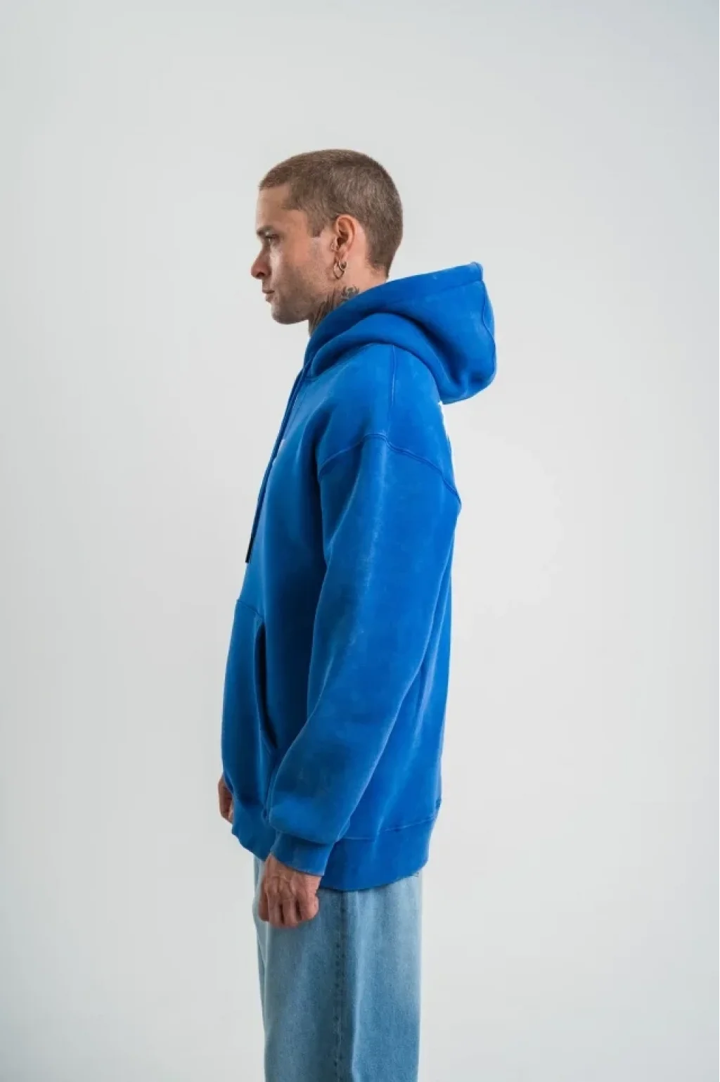 Uzun Kol Kapşonlu Yıkamalı Baskılı SweatShirt - Mavi