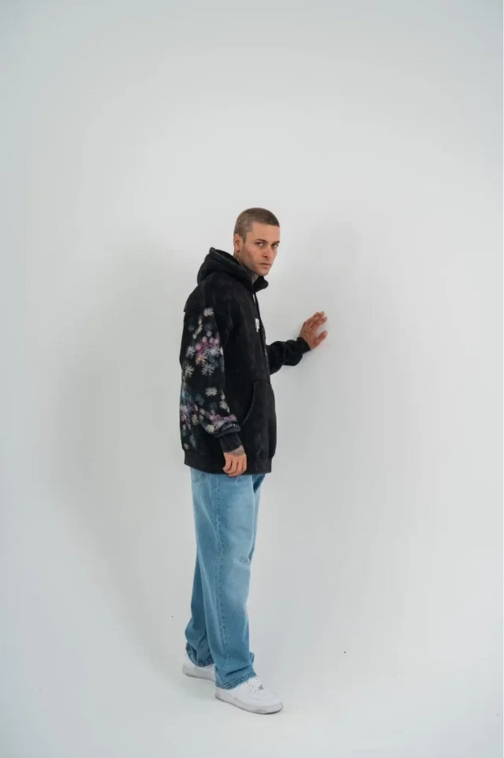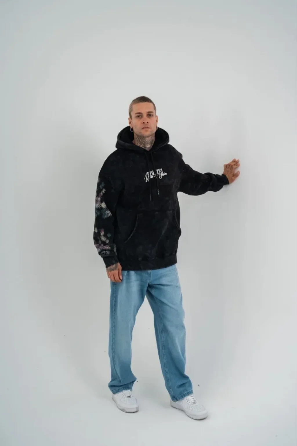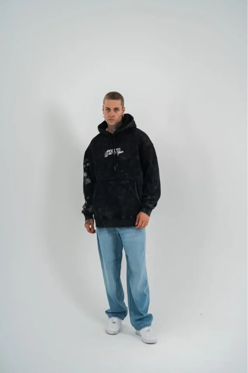 Uzun Kol Kapşonlu Yıkamalı Baskılı SweatShirt - Siyah