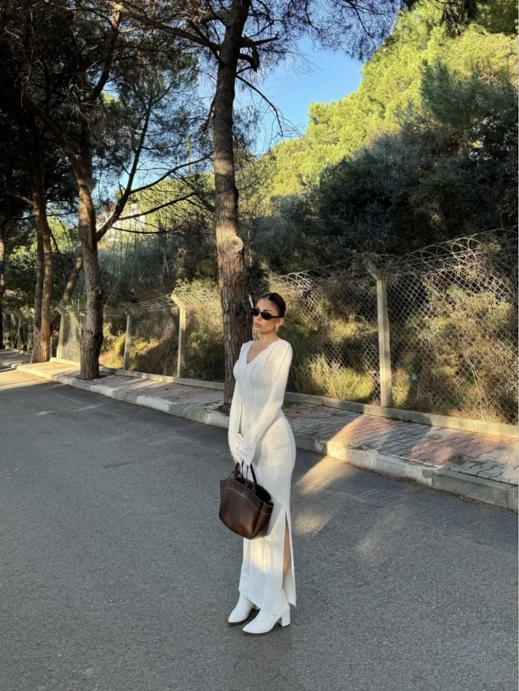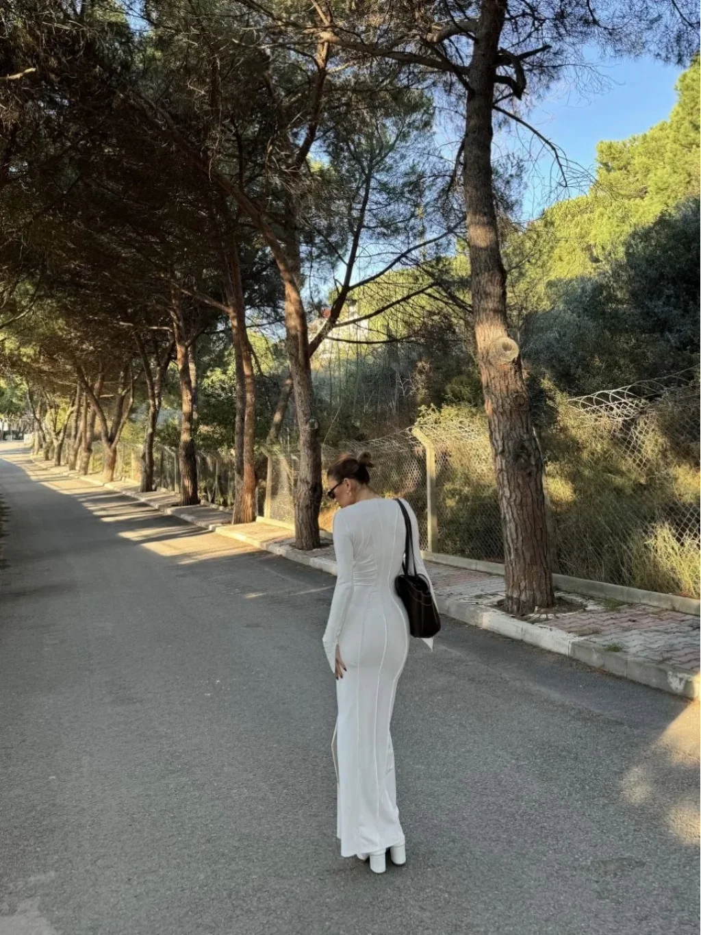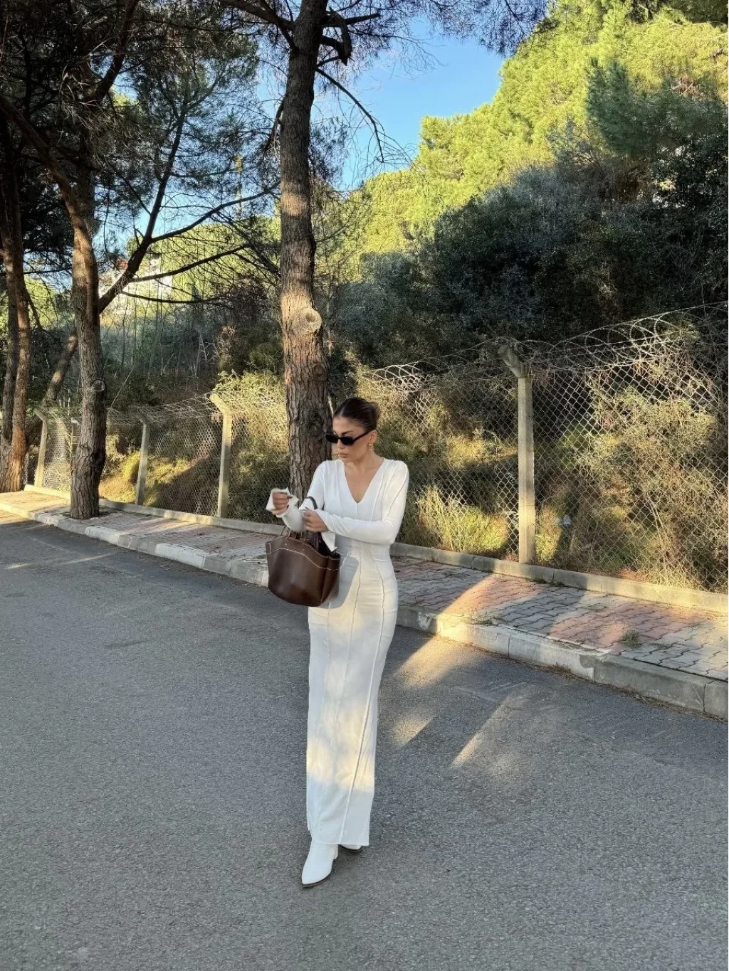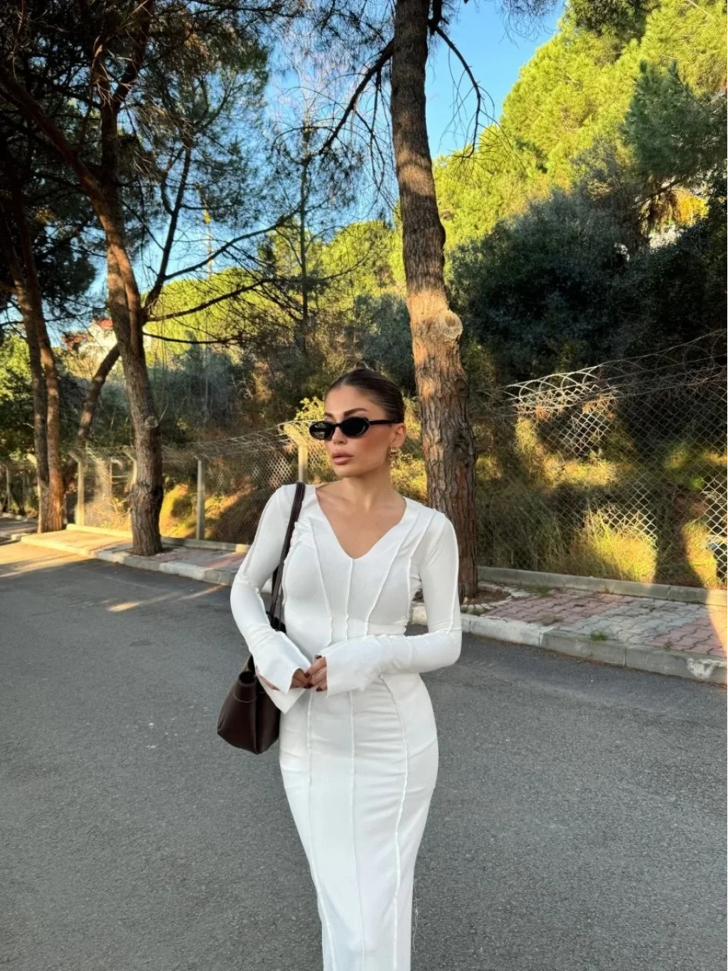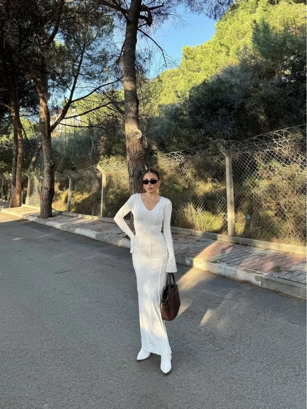 V Yaka Karoyaka Dikişli Yırtmaçlı Uzun Elbise - Beyaz