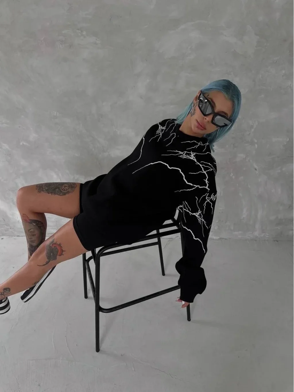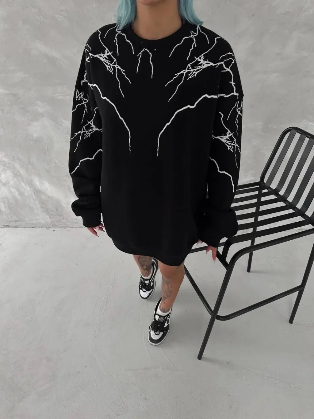 Yıldırım Baskılı Bisiklet Yaka SweatShirt - Siyah
