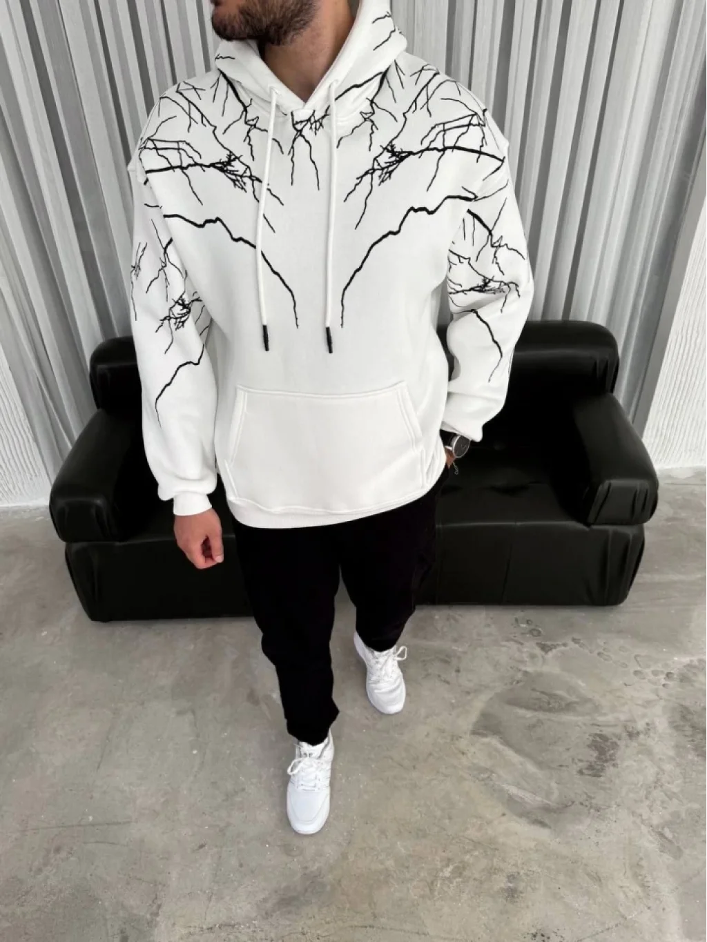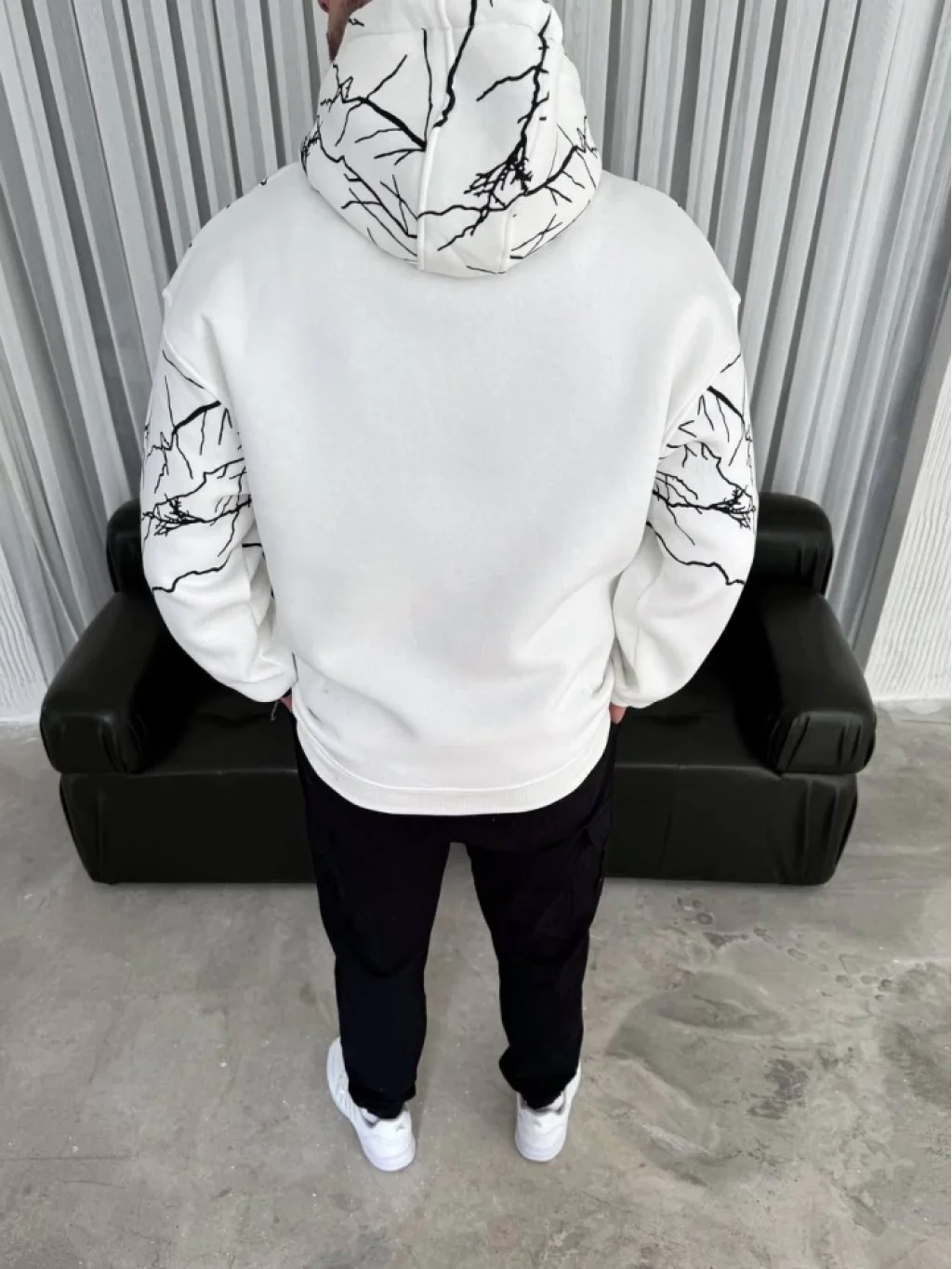 Yıldırım Baskılı Kapşonlu SweatShirt - Beyaz