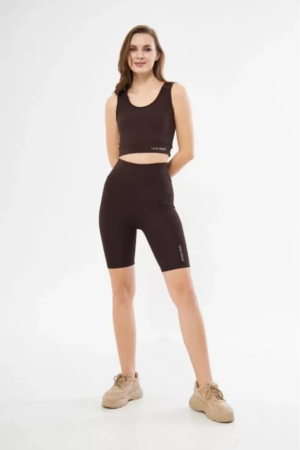 Yüksek Bel Dalgıç Croplu Biker Şortlu Takım - Kahve