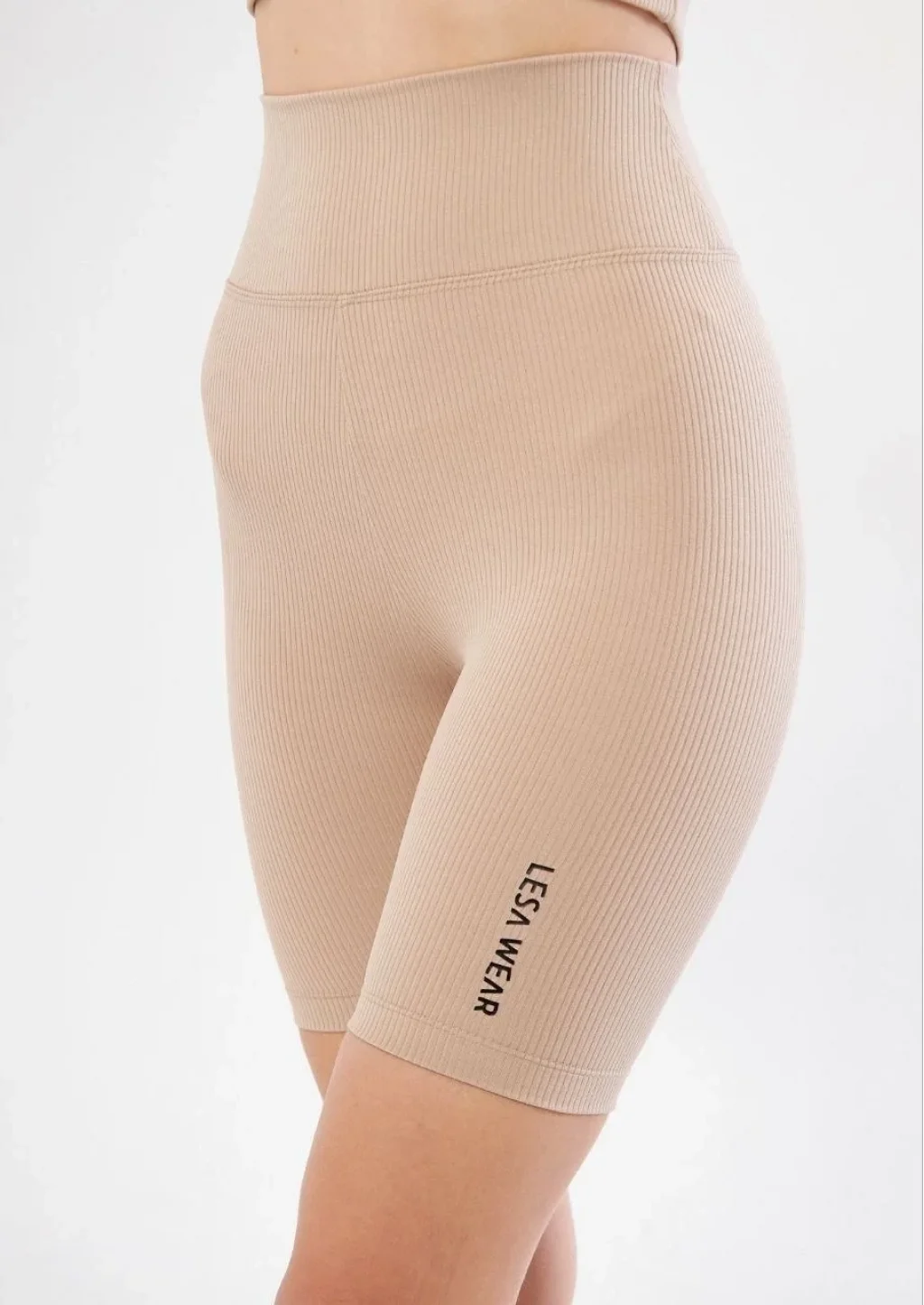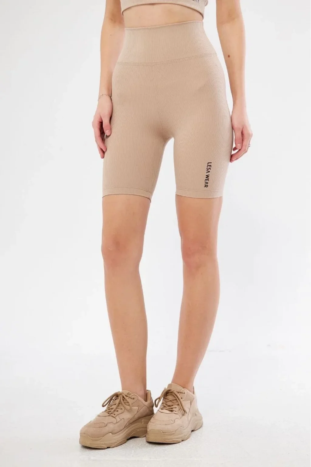 Yüksek Bel Fitilli Biker Baskılı Şort - Bej