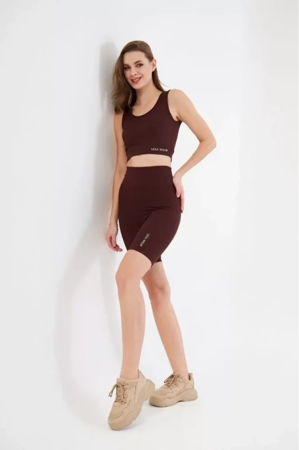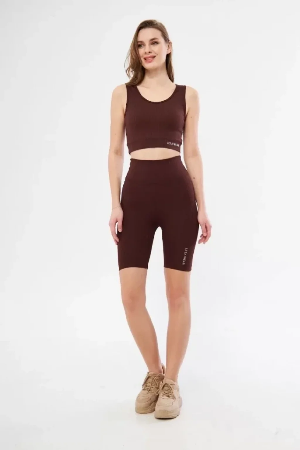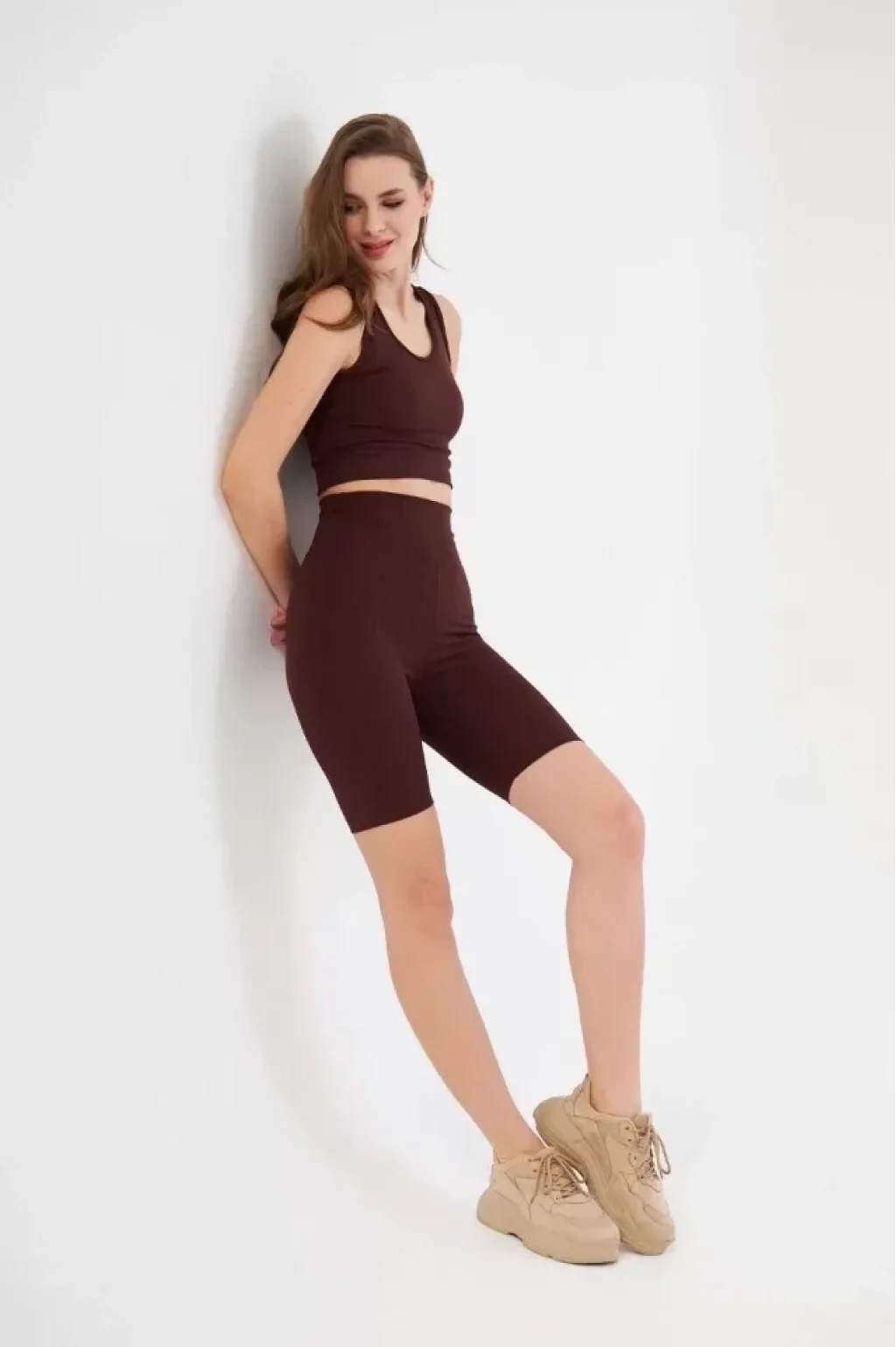Yüksek Bel Fitilli Croplu Biker Şortlu Takım - Bordo