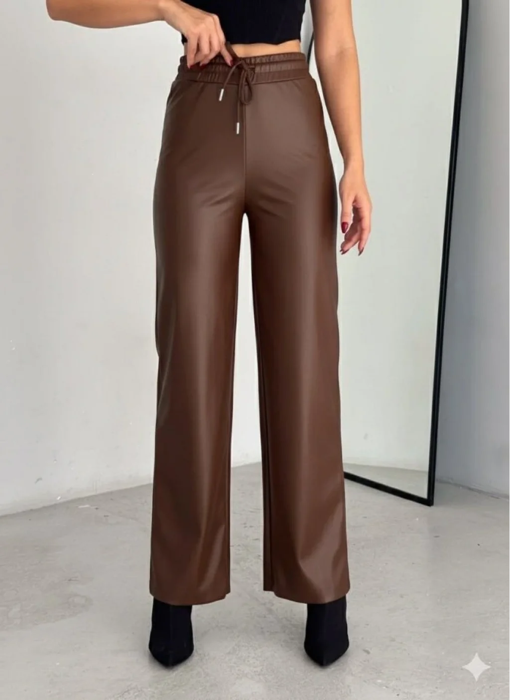 Yüksek Bel Geniş Paça Içi şardonlu Deri Pantolon.